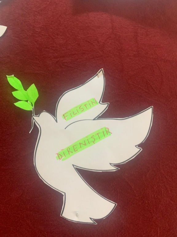 Öğrencilerimizin el emeğiyle hazırladığı bu mesajlar, bilişim alanı panosunda “Filistin’e Barış Kanatları” başlığıyla sergilendi.