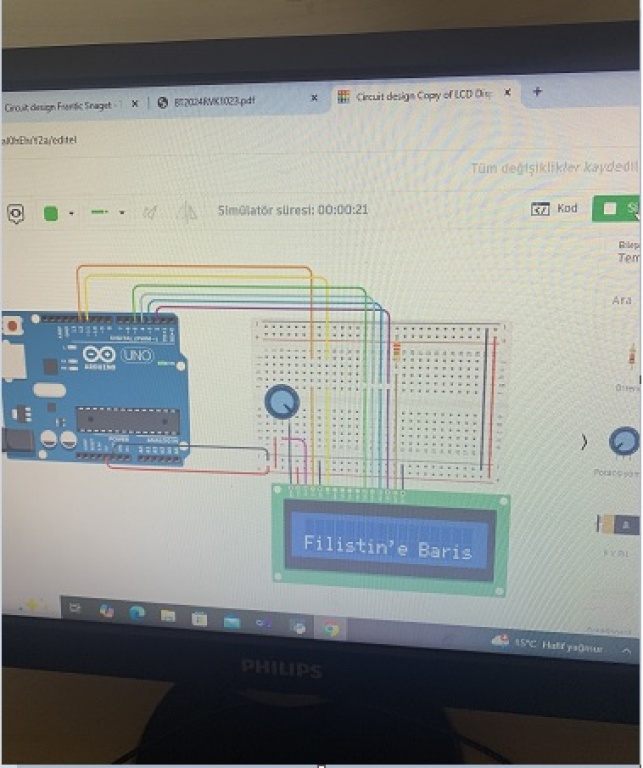 Bilişim Teknolojileri atölyesinde Robotik Kulübü öğrencileri tarafından hazırlanan etkinlik kapsamında, Arduino kontrollü LCD panel kullanarak(Filistin için Barış) mesajını yansıtıp barış temasını teknolojiyle birleştirdiler.