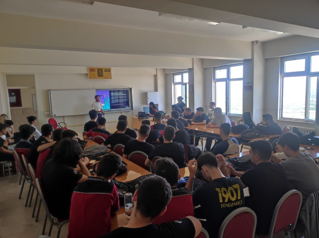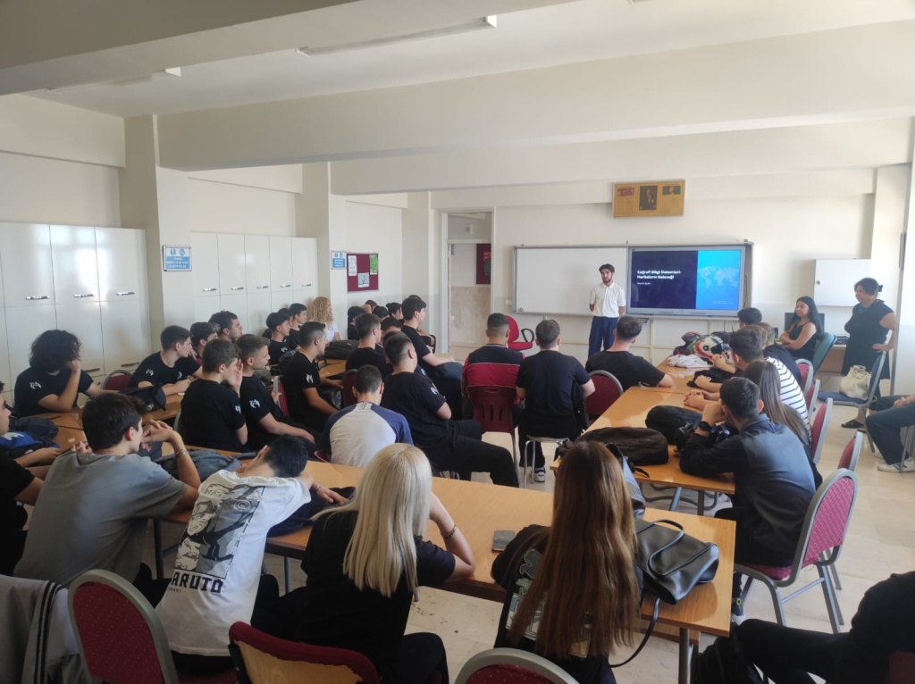 Mezun öğrencimiz Nevzat İŞLEK ve Büşra ERTUĞRUL, öğrencilere harita analizi, uzaktan algılama ve veri işleme gibi konularda bilgiler sundu. Her iki alan içinde ortak iş imkanları sunan bu bölümü tanıttılar.